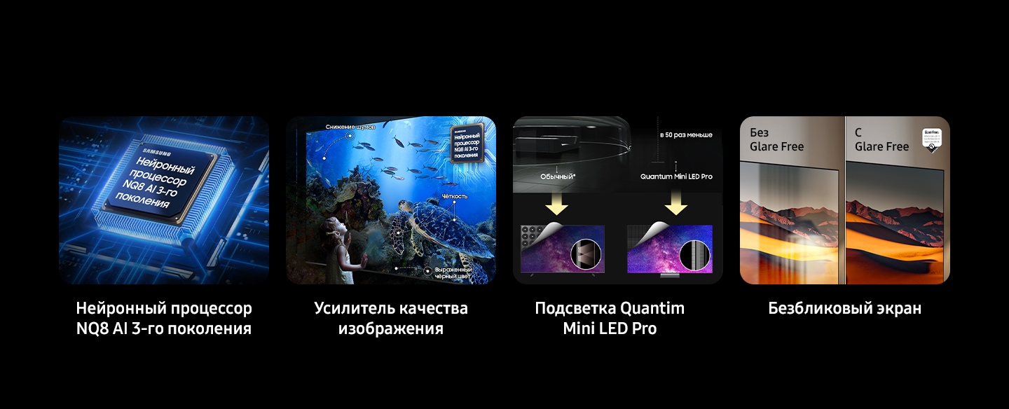*Качество изображения зависит от типа и формата видеоданных. QN90F 43"-98" оснащены процессором NQ4 AI Gen3; QN90F 115" оснащен процессором NQ8 AI Gen3.